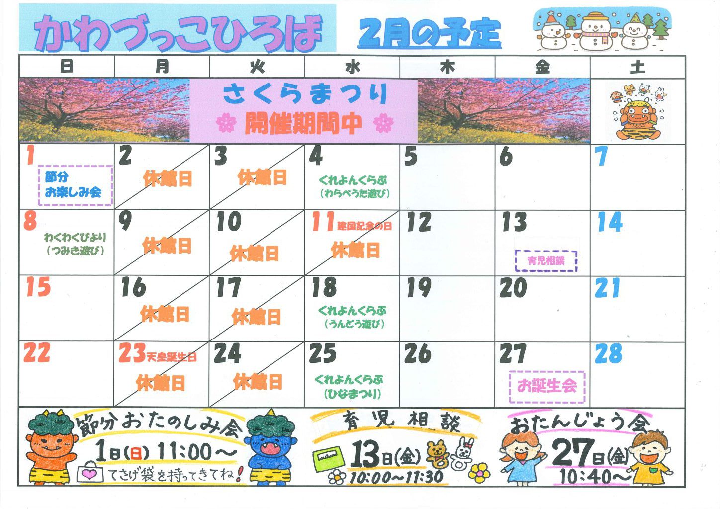 今月の子育て支援センター「かわづっこひろば」の予定です。
